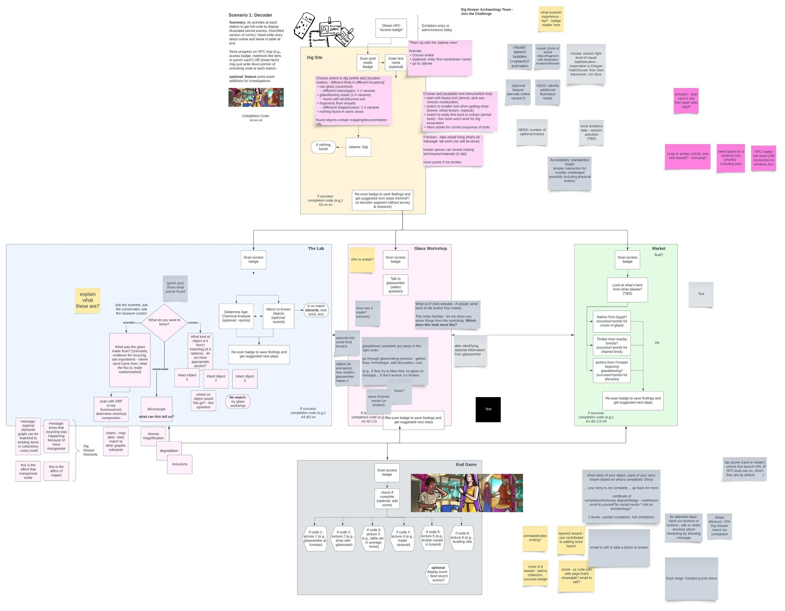 Defined end-to-end user flows across four physical stations (Dig Site, Archaeology Lab, Glass Workshop, Marketplace)