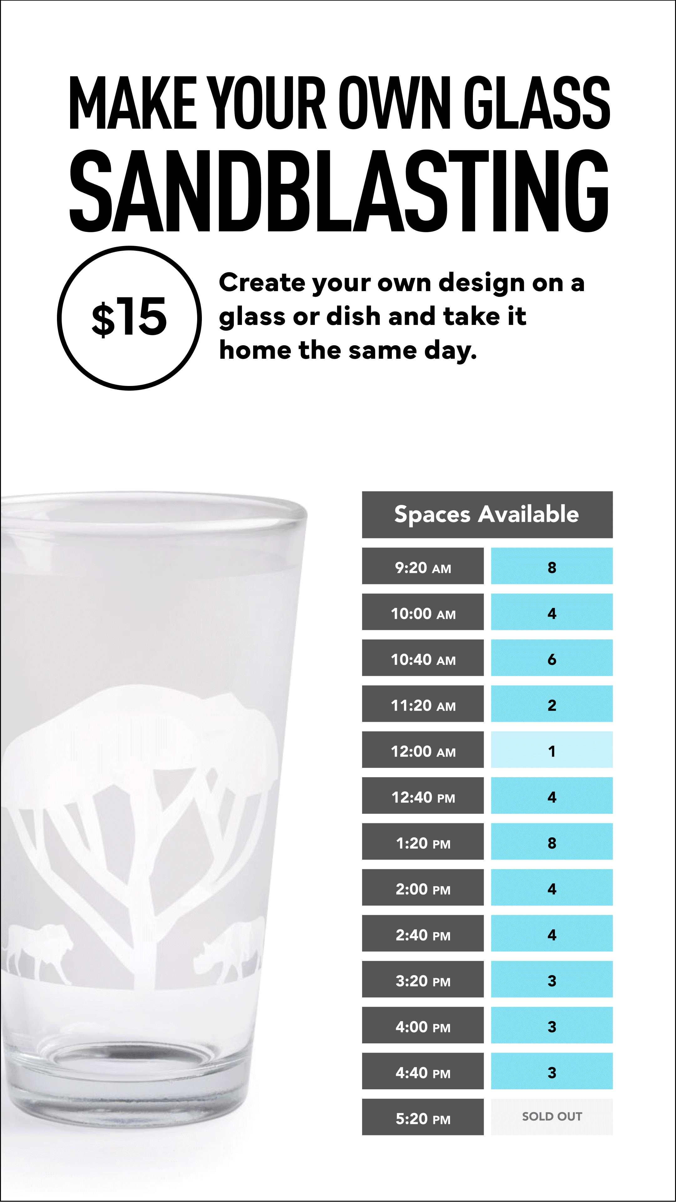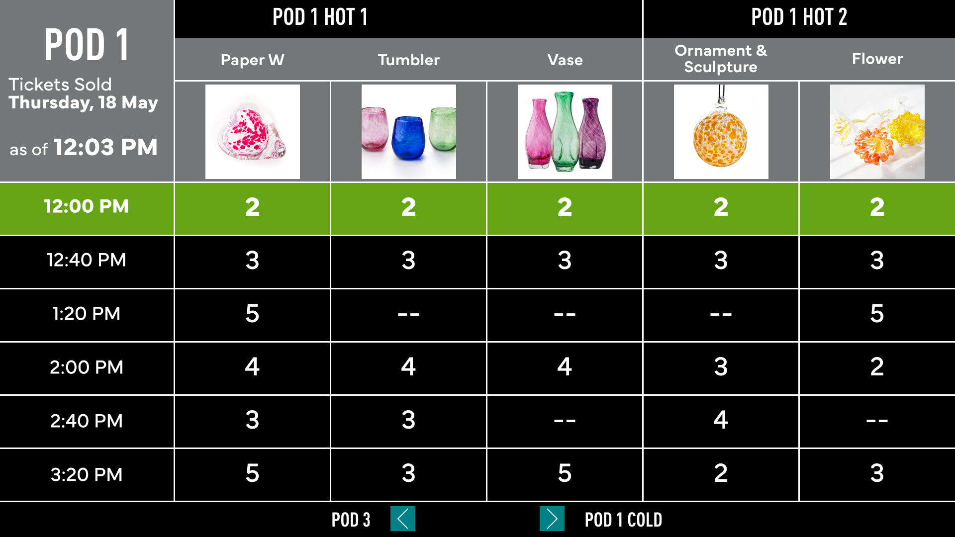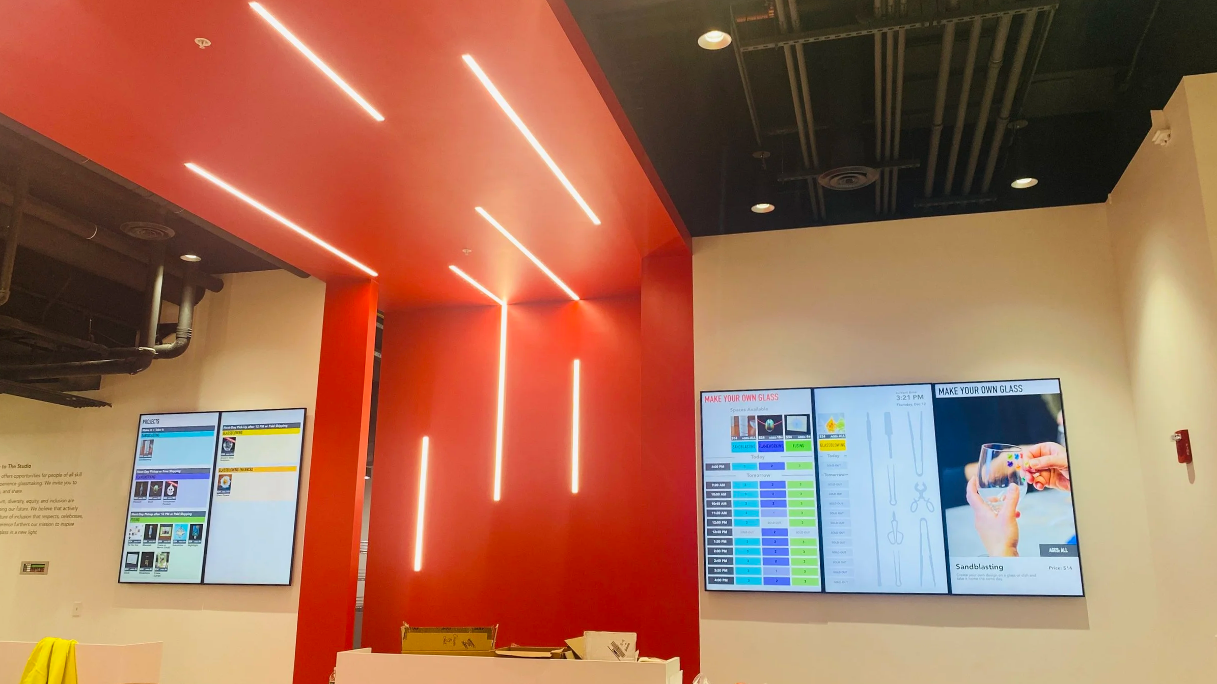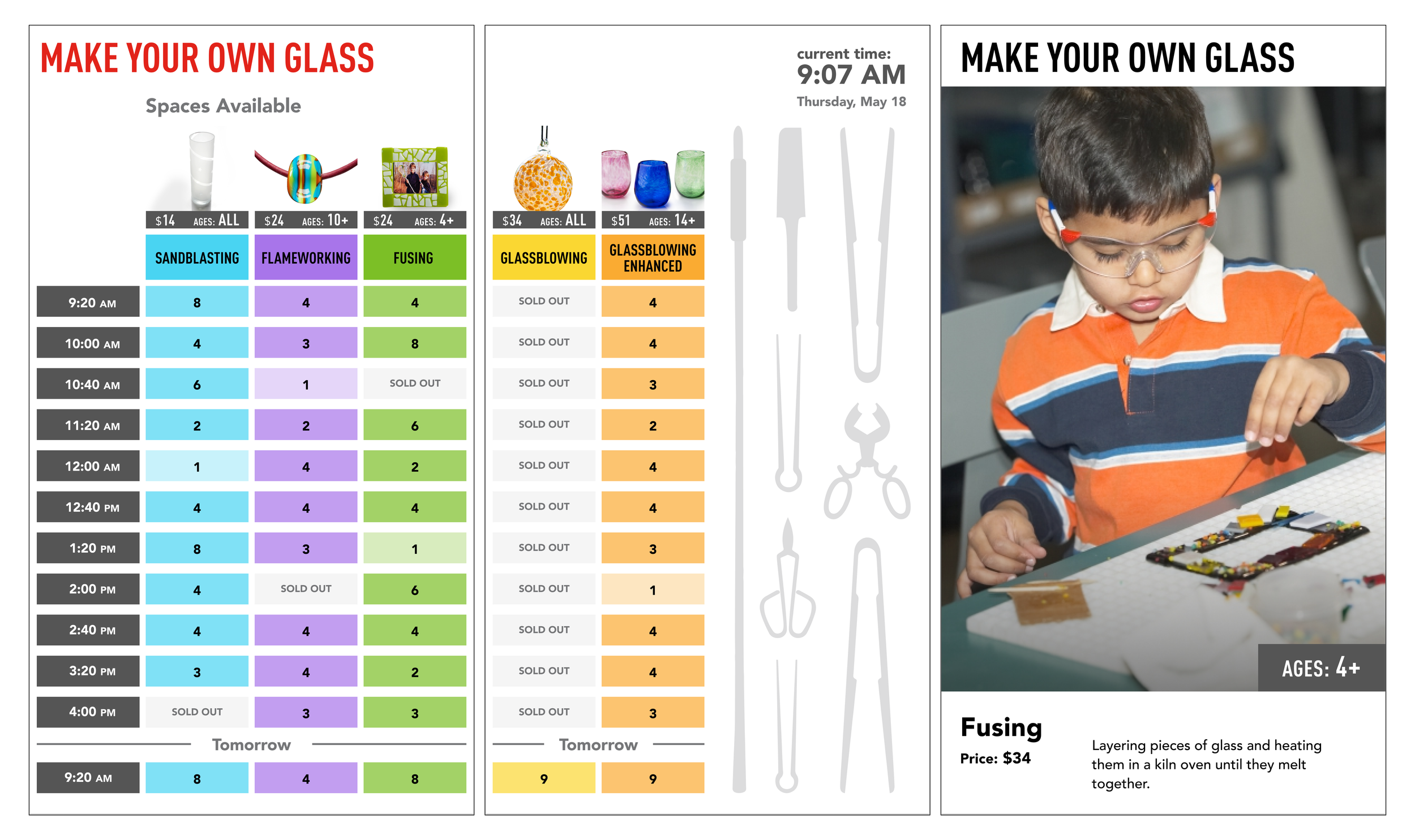 A real-time digital signage system for high-traffic, time-sensitive glassmaking programs. Makes availability, capacity, and scheduling visible at a glance, reducing queue friction and supporting both visitors and staff.