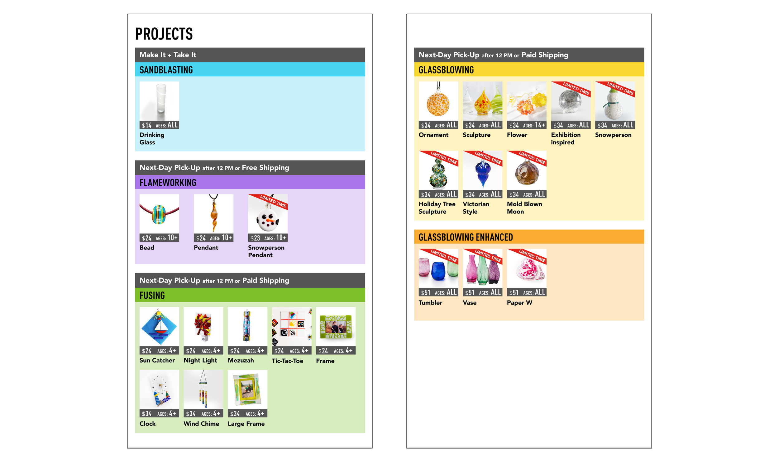 Activities are color-coded and grouped by glassmaking technique, helping visitors differentiate options quickly.
